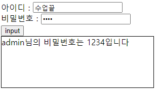 divEl.innerHTML=input1.value+"님의 비밀번호는 "+input2.value+"입니다";